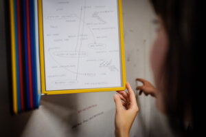 1. In the city space of Sokolowsko I shall set up daily a small coffee table with two chairs on a rather busy street and ask passers by to joint me for a short conversation lasting ca. 10-15 minutes. I will be asking specific questions and directing the course of the conversation. While doing so I will be gathering words, which seem to be essential or that are often repeated and generate a ‘Word-Portrait’ of the person. Together with that person I will draw connecting lines between the words and make a ‘Thought-Map’.Afterwards I will invite the person to expand on the semantic meaning of some chosen words.