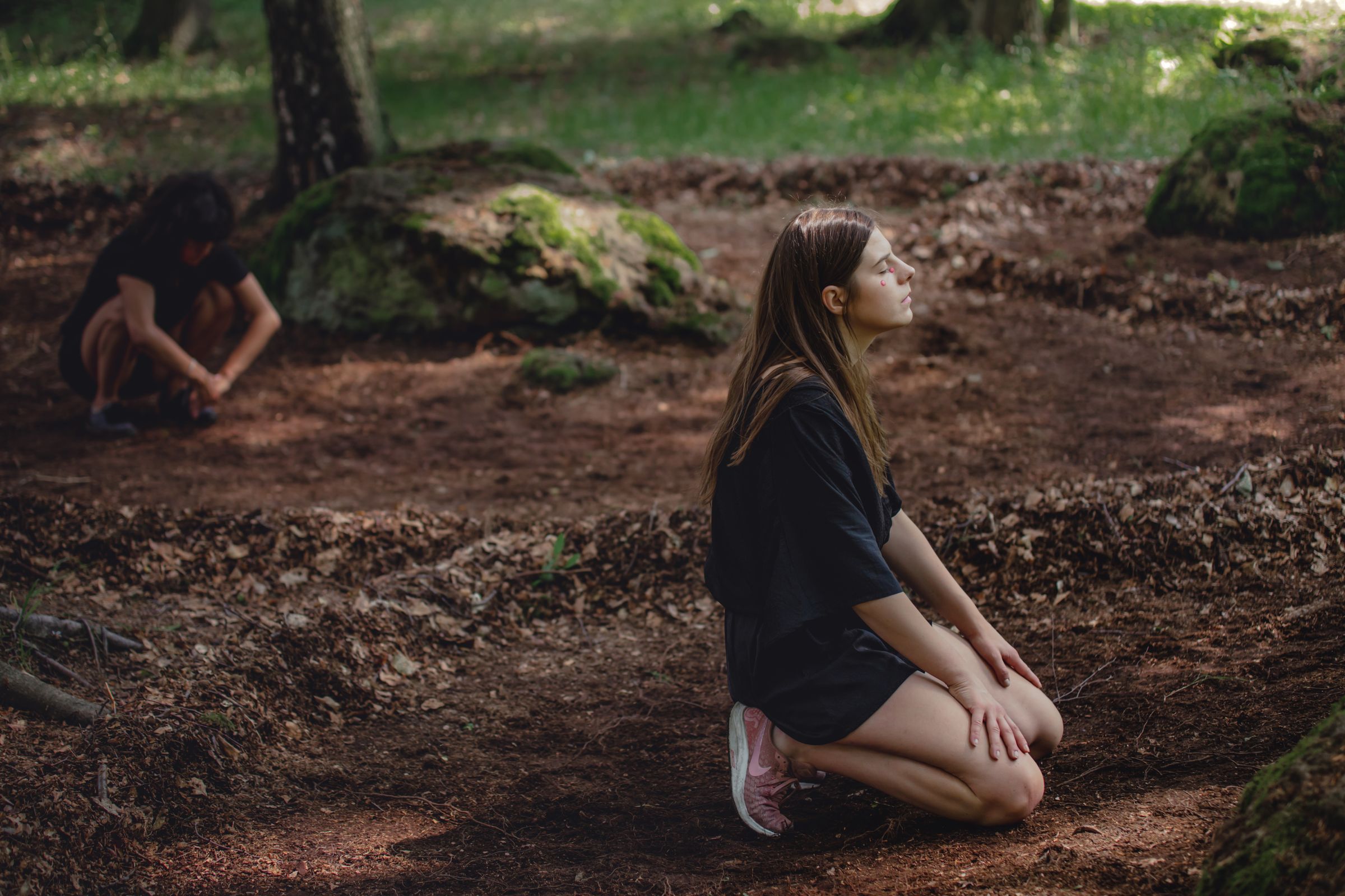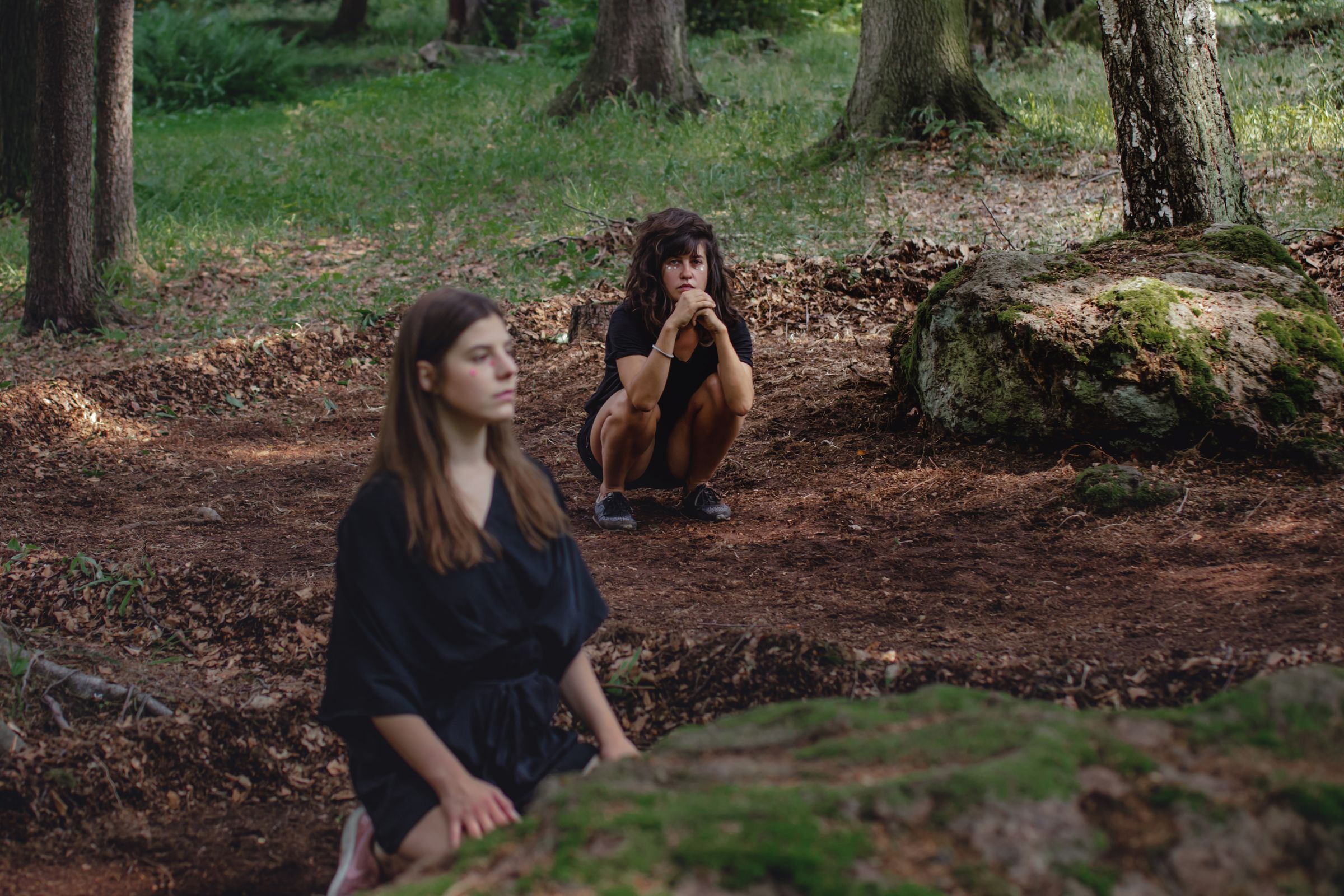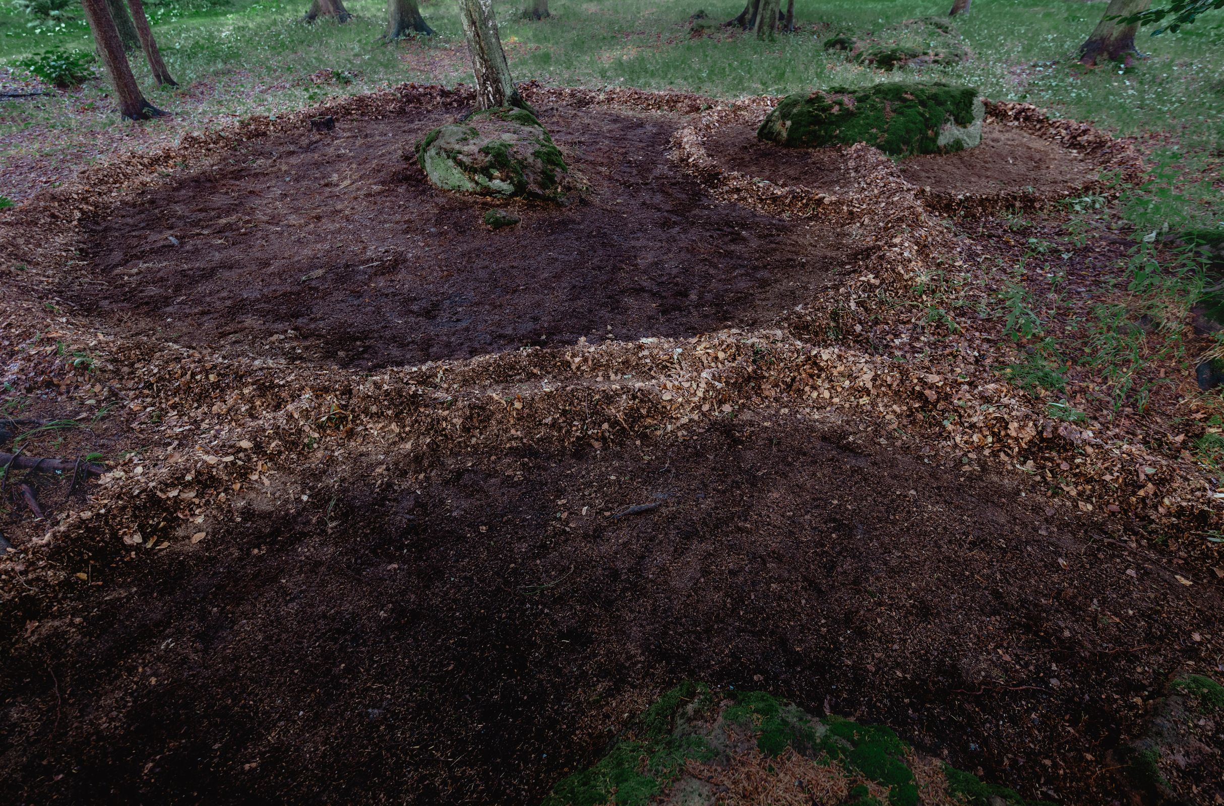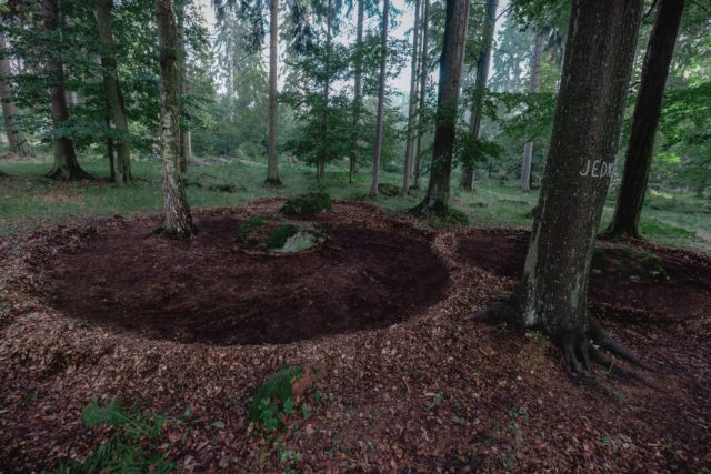 The installation consists of three circles drawn in the forest soil, which borders of which crossed. The center of each of them was a performer standing on boulders.