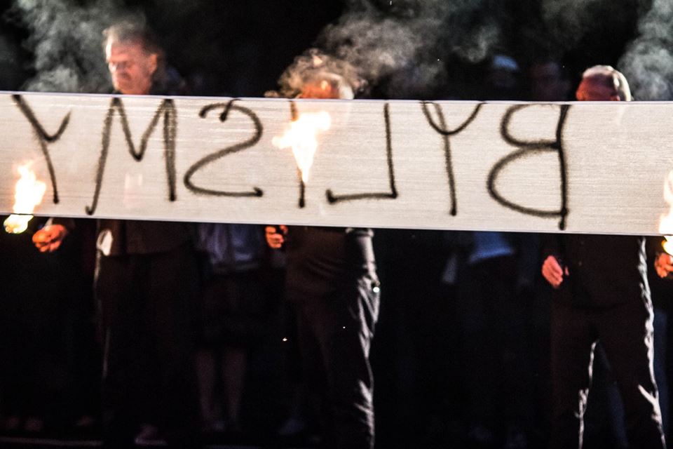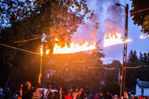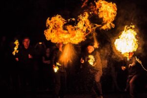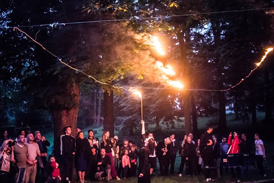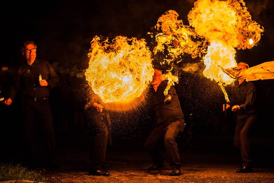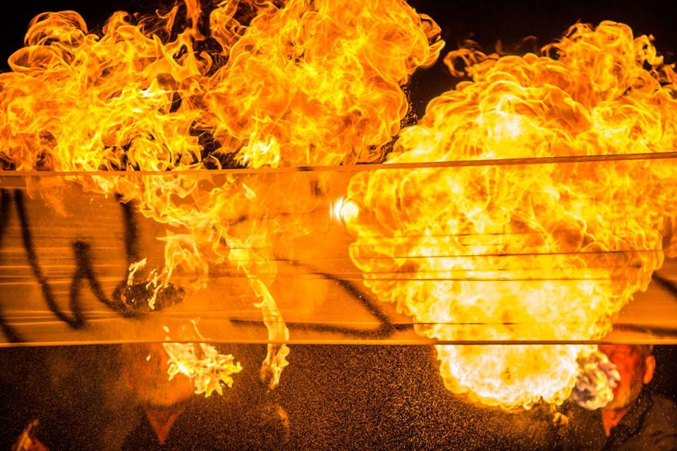 After all the banners had been filled with lines of „poetry”, the performers moved from one banner to another in a line, blowing fire, causing the banners to burn (in a suggestion of the idea of words being absorbed by the atmosphere), and revealing one verse of the „poem” after another.