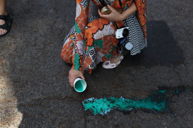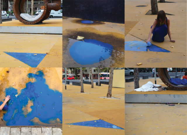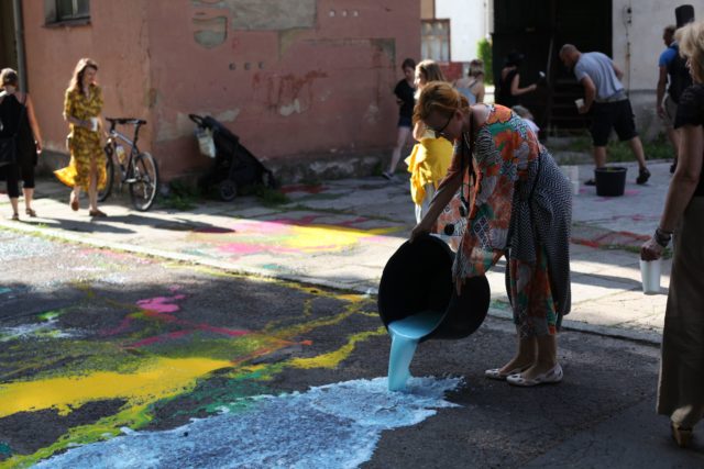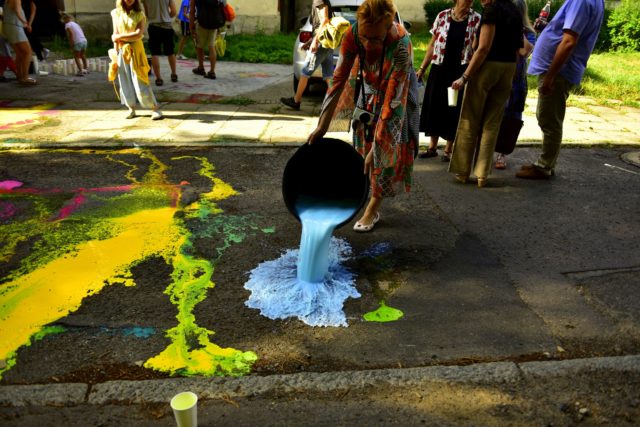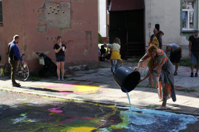 She has dealt with artistic actions in public space since 2011 as a painter, performer and author of ephemeral and stable installations. Color stain as supplement, disruption or balance of an existing phenomenon dominates in all her projects. What has been most appealing to her, is geometry of grey urban spaces inhabited by human emotions. The reason of her periodic “runaway” from the atelier to public space was solitude, and her inspiration for the „Un-grey the City” project and creating colourful puddles was ugliness and neglect of surrounding urban space.