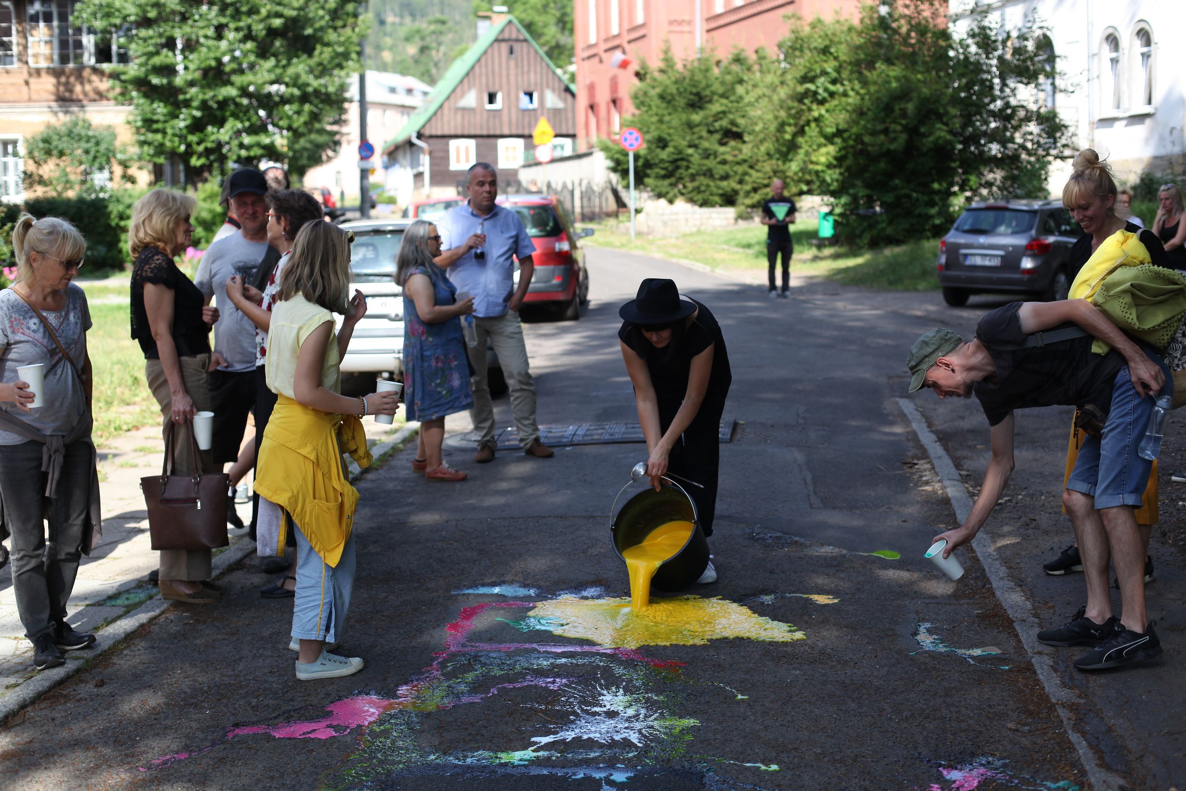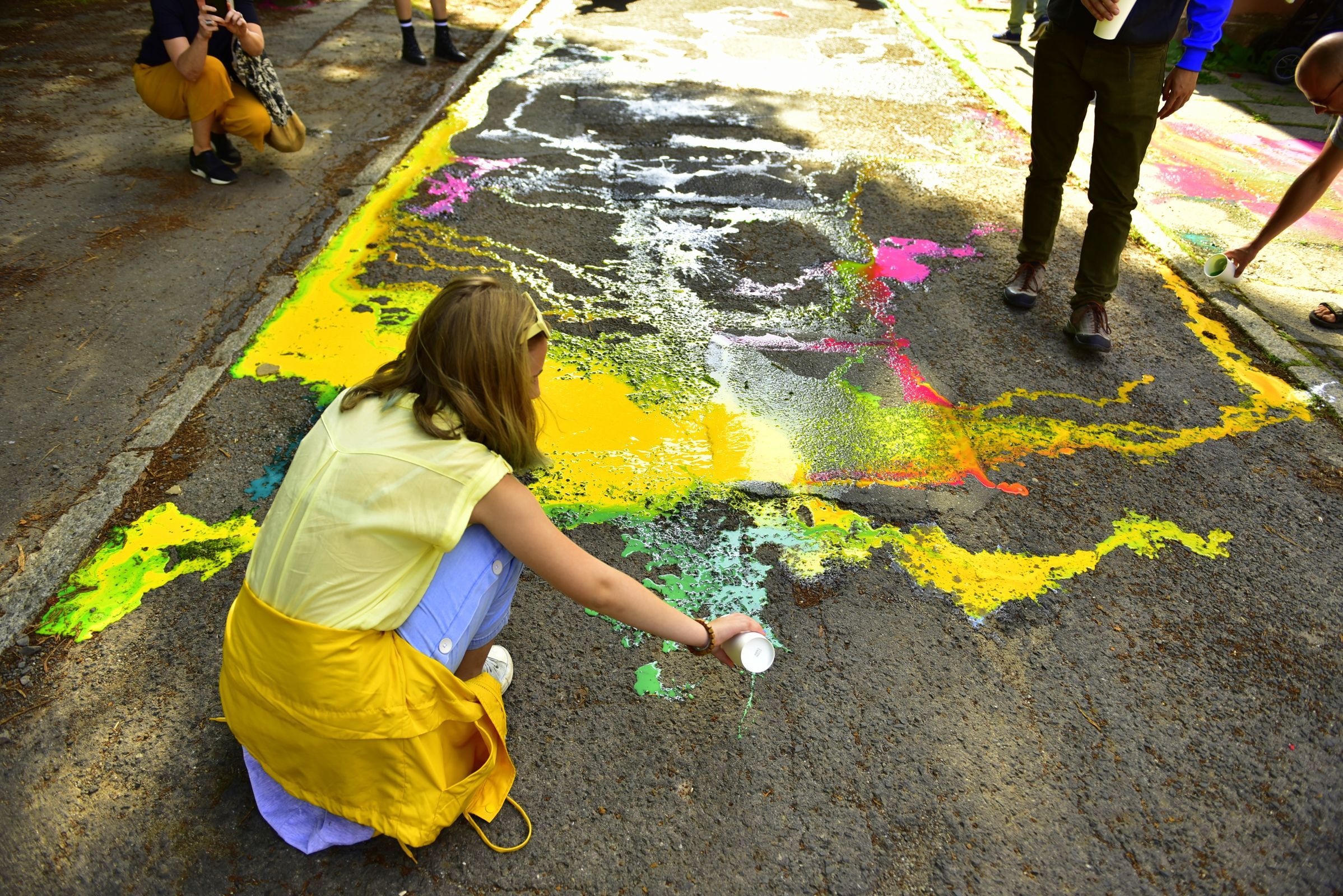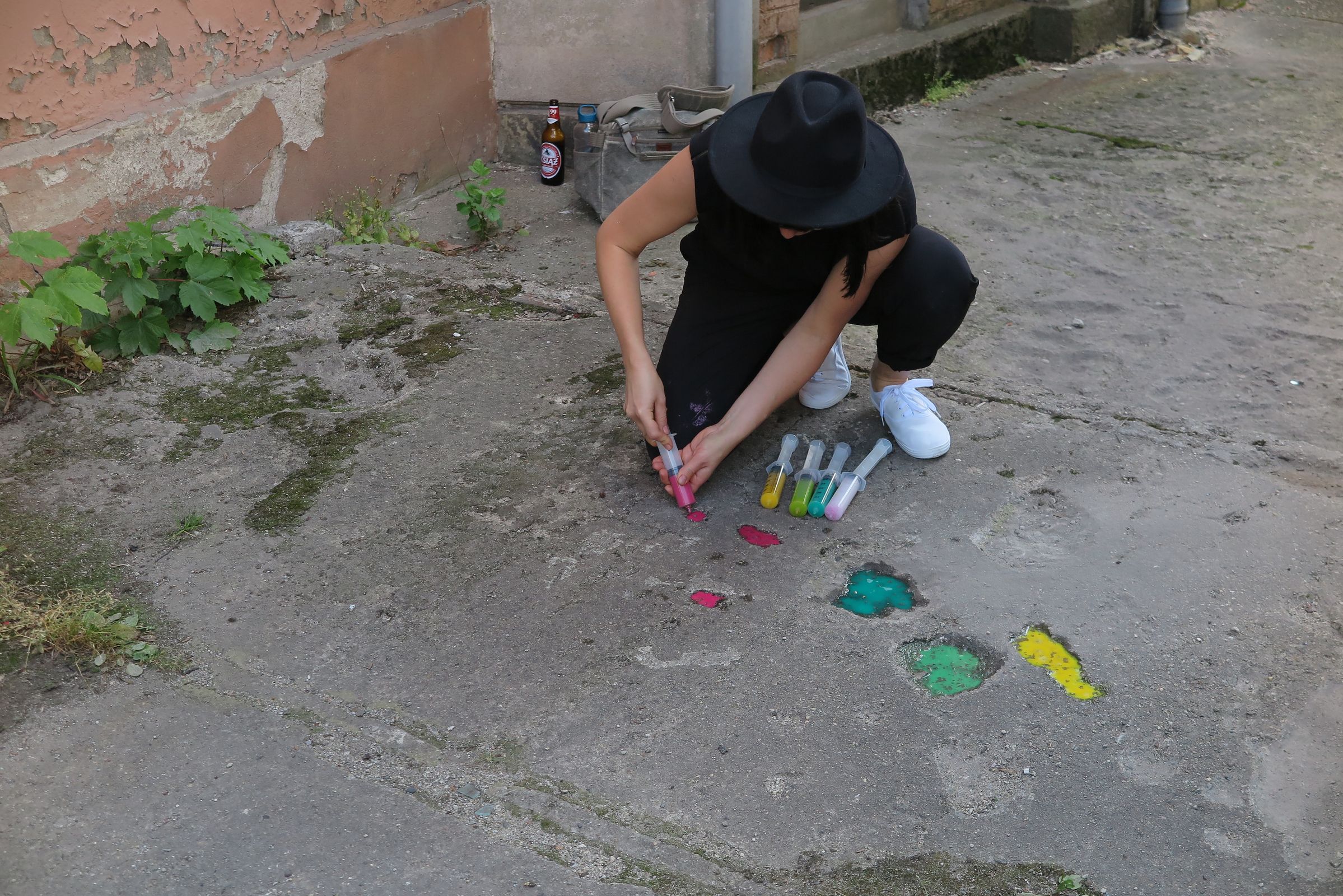 She has dealt with artistic actions in public space since 2011 as a painter, performer and author of ephemeral and stable installations. Color stain as supplement, disruption or balance of an existing phenomenon dominates in all her projects. What has been most appealing to her, is geometry of grey urban spaces inhabited by human emotions. The reason of her periodic “runaway” from the atelier to public space was solitude, and her inspiration for the „Un-grey the City” project and creating colourful puddles was ugliness and neglect of surrounding urban space.