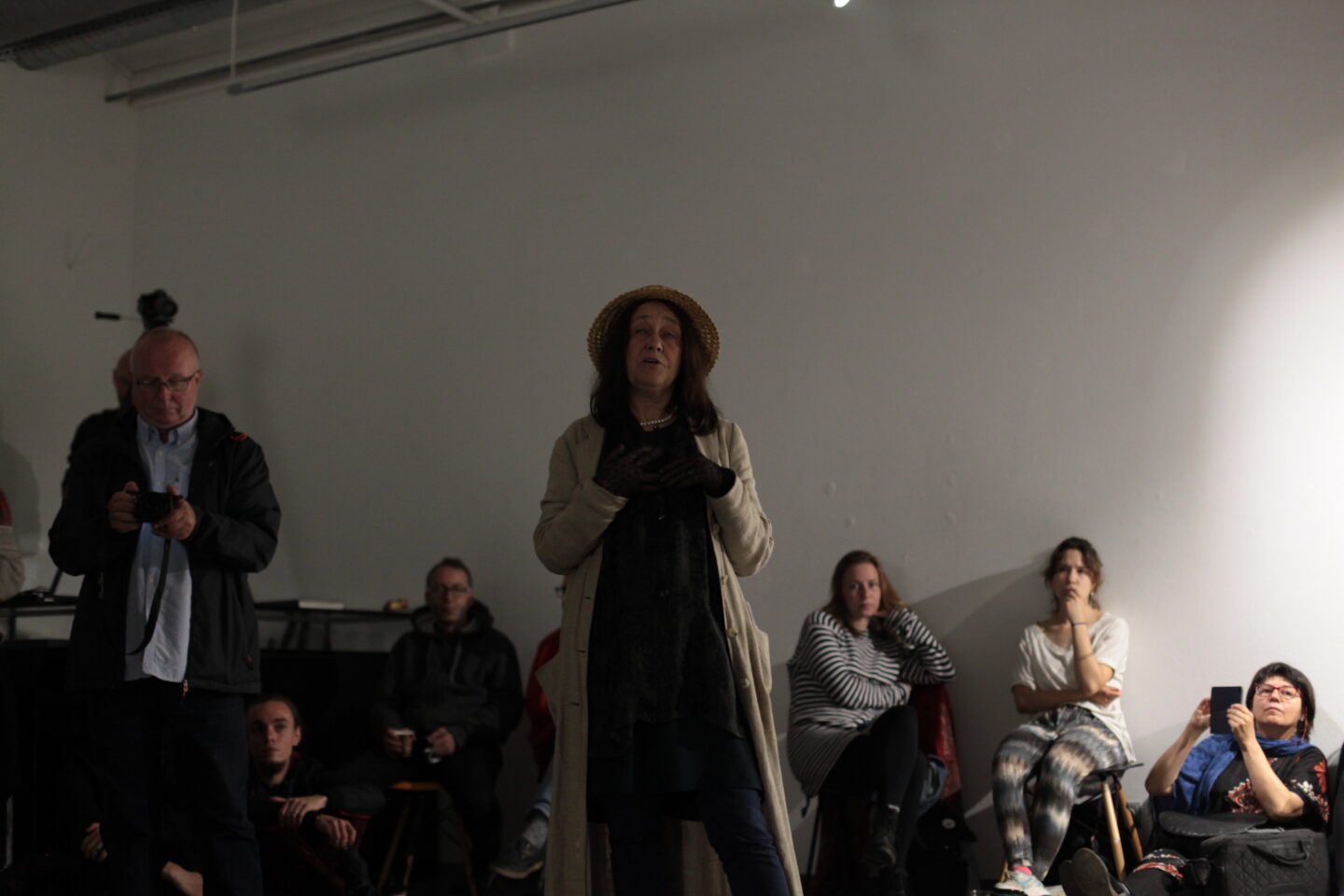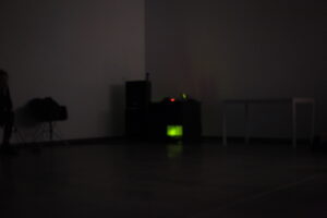 The artist moves among the audience in the dark. He creates sound that makes the audience feel as if they were in a shop selling breathing air and heard that it has been sold out, but it is still there.