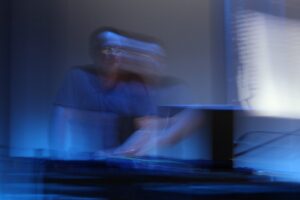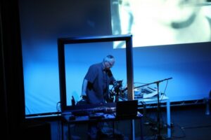 Krzysztof Knittel with a built by Piotr Sycha electronic midi harp (controlled with an infrared remote), accompanied by percussion instruments plugged into a Max/Msp computer program, and Grzegorz Rogala with self-constructed audiovisual “instruments”, will play two roughly 30-minute improvisations.