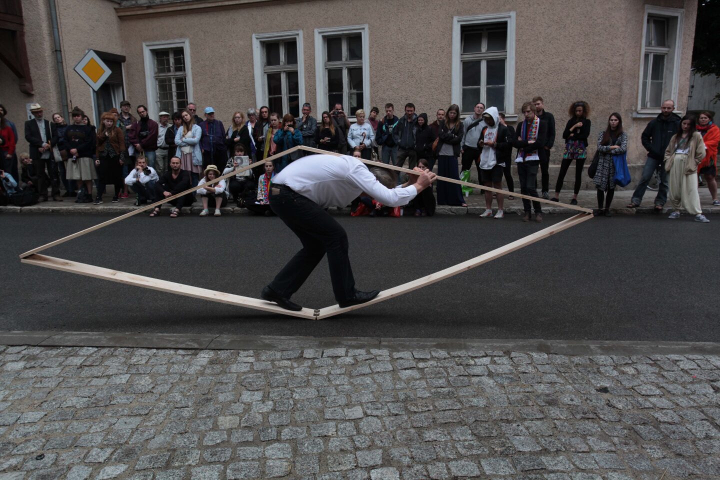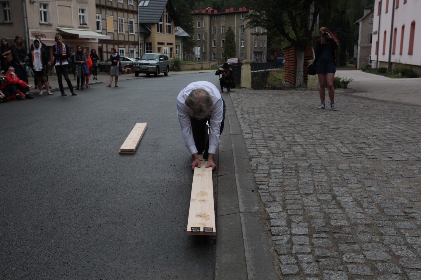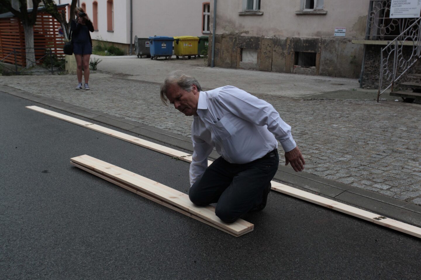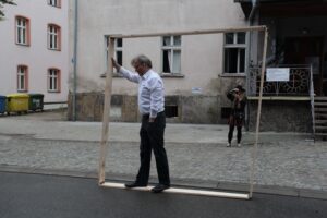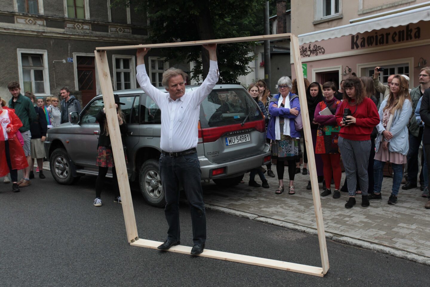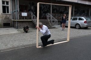 A View into the Window 2017 is a performance that refers to the performance of 1997 A View into the Window realized in at Andrzej Mroczek’s Gallery in Lublin. It is a kind of vehicle that moves along the street, up and down. A man is enclosed in a frame, almost biologically connected with his body and taking over the characteristics of human existence – tensions, resistance and aspirations.