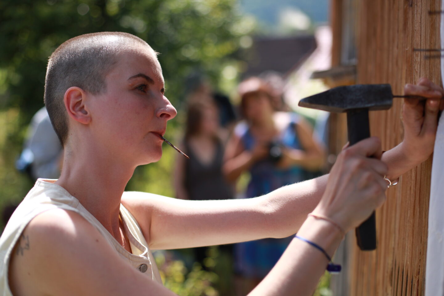 She works in between, on the edge of definitions: performs, writes poems, builds installactions. Recognises the constant variable of subjectivity between the viewer and performer.