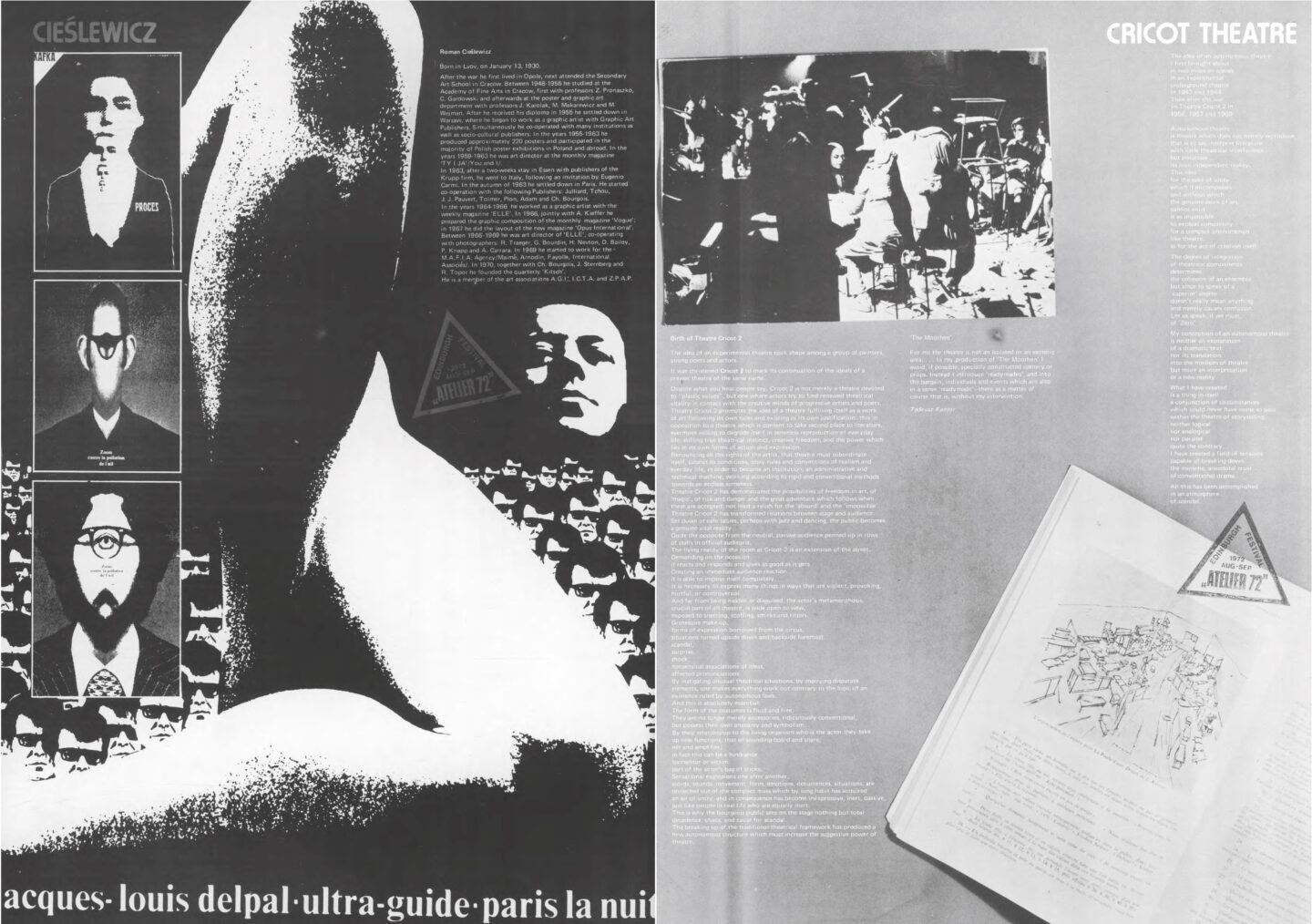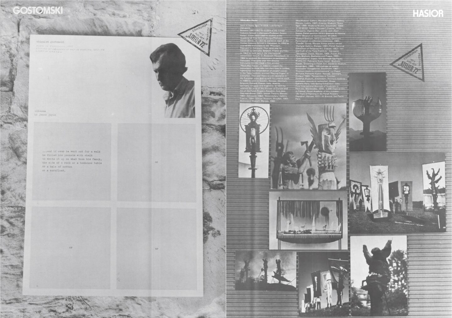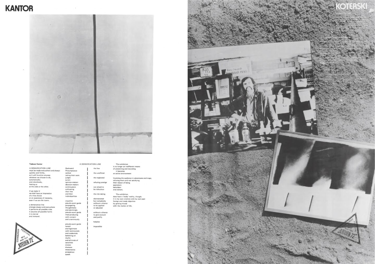 On the first day of the festival we open Atelier 72 Revisted exhibition. It provides a new perspective on the groundbreaking exhibition of Polish contemporary art curated by Richard Demarco in the scheme of Edinburgh Festival in 1972. The enlarged pages of the original catalog, each of them devoted to one artist/group and designed by him/her will be a starting point of the exhibition. We present works of selected participants of the cult exhibition, also the ones that were created after 1972. The exhibits are paintings, graphic works, posters, films, video, photographs, sculptures, installations, sound pieces and documentation. The exhibition arranged in the form of a labyrinth which relates to the historical aspect, multilayered nature of time and variety of genres is shown in multimedia space of the sanatorium (transformed into the laboratory of art), cellars, corridors and tower. It uses the genius loci of Sokolovsko, a place of healing which relates to Richard Demarco advocating the healing properties of art, transgressing political and national divisions.
